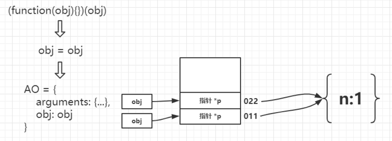 函数立即执行,此时将全局obj赋值给形参obj,我们忽略这个重复命名的问题,其实就是将011中的 指针*p拷贝了一份给了022。同时执行第一个console.log(obj.n)结果即为1。
