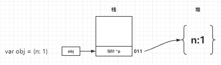 首先执行var obj = {n: 1}; ,可以看作在栈的001地址中存入了一个指向{n:1}的指针*p