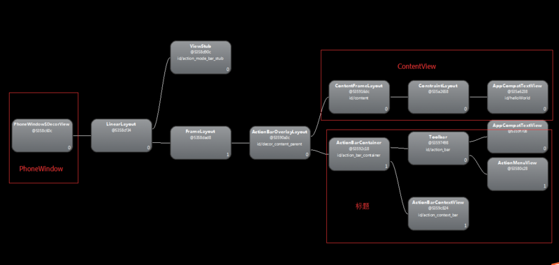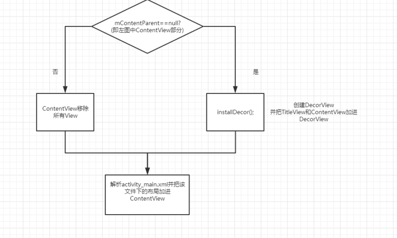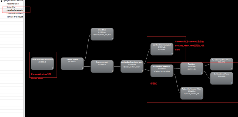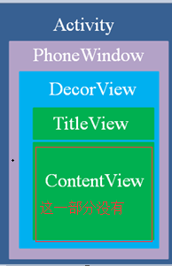 这次我们再来看一下这个层级图是不是理解的更清晰了呢。我们的setContentView(R.layout.activity_main);内部把activity_main.xml文件解析成View,并把该View添加到contentView。