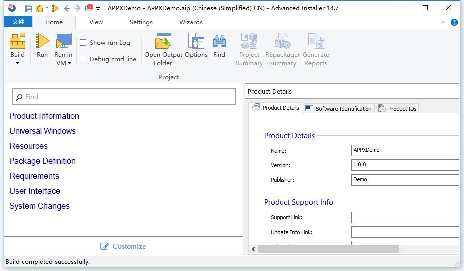 到这里我们新建的项目中的 Windows Form EXE 就成功 Build 为 APPX 包了,接下来是 Advanced Installer 的主要编辑部分,我们可以对以下部分进行编辑: