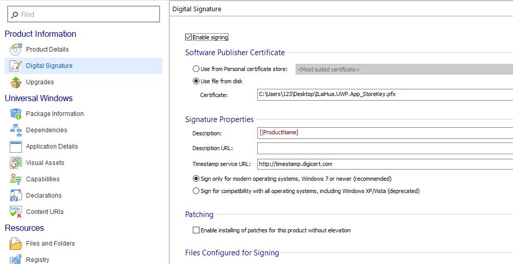 为了让转换后的 APPX 可以直接在系统安装,需要设置数字签名,这里我使用了一个已有的 UWP 应用的 PFX 数字签名文件。如果大家有认证过的数字签名证书,也可以拿来用。