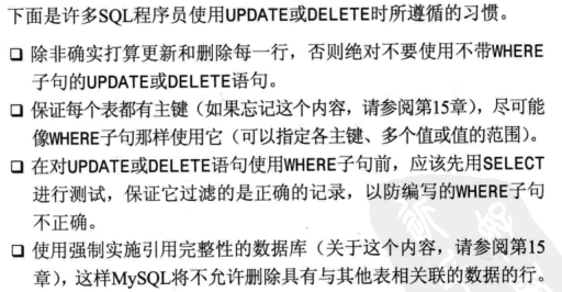 如果想从表中删除所有行,不要使用DELETE。可使用TRUNCATE TABLE语句,它完成相同的工作,但速度更快(TRUNCATE实际是删除原来的表并重新创建一个表,而不是逐行删除表中的行)