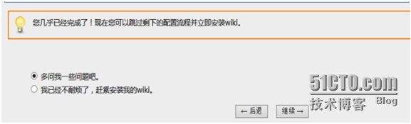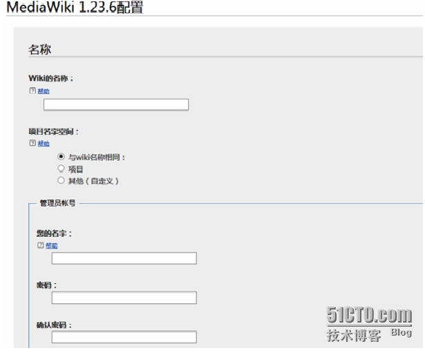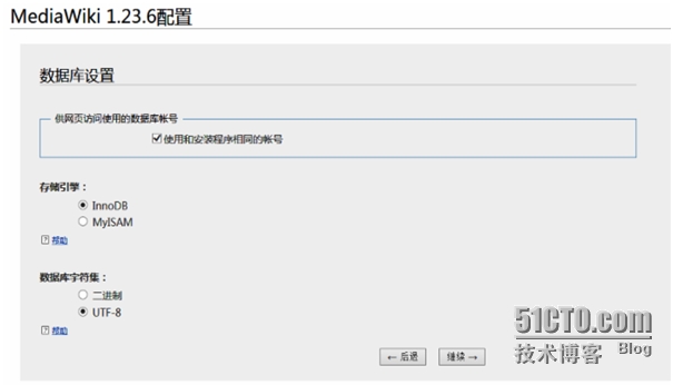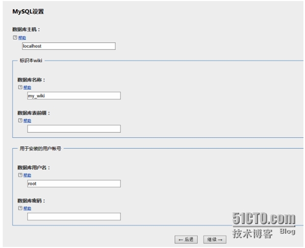 这里的教程是使用本地数据库,数据库名为刚才创建的数据库: wikidb ,账号密码与前面教程提到的一致即可,当然也可以使用 root 账户,但是不推荐这样设置;数据库表可以留空,不用设置。