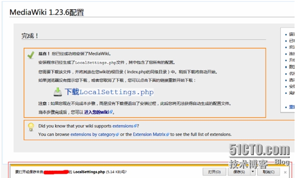 继续之后,配置完成。还有一步需要完成。这时候页面会弹出来一个配置文件,需要放到与 index.php 在同一目录下: