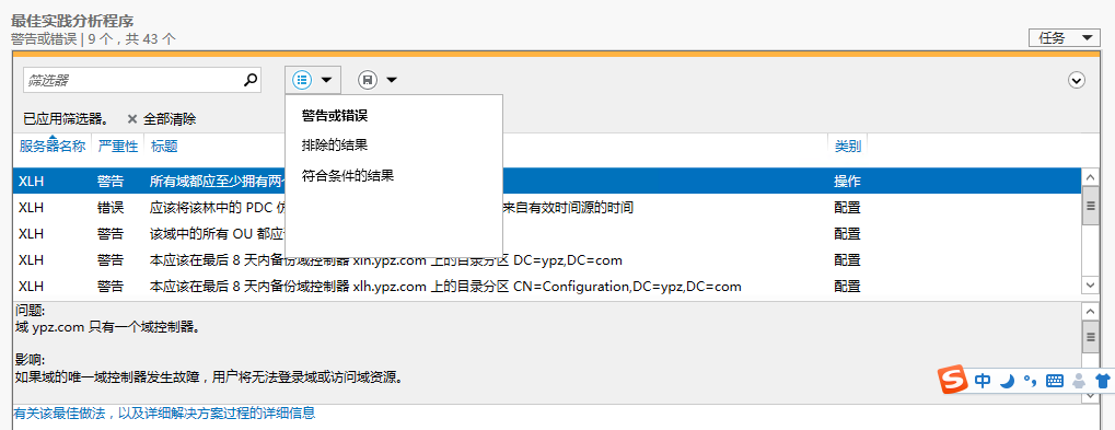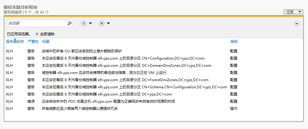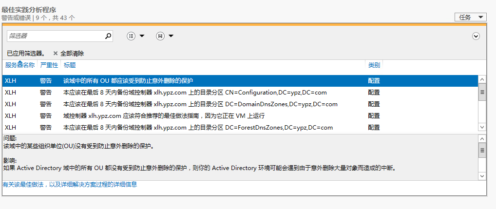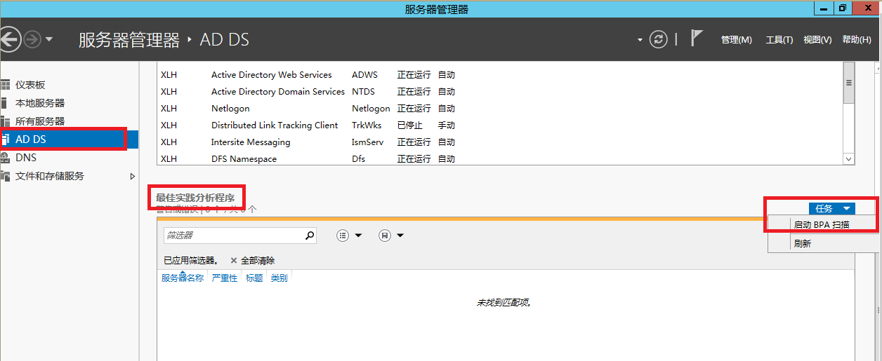 1、打开“服务器管理器”;选择“AD DS”滚动右边的滚动条,滚动到“最佳实践分析器”选择右上角“任务”边上的小三角,选择“启动BPA扫描”;