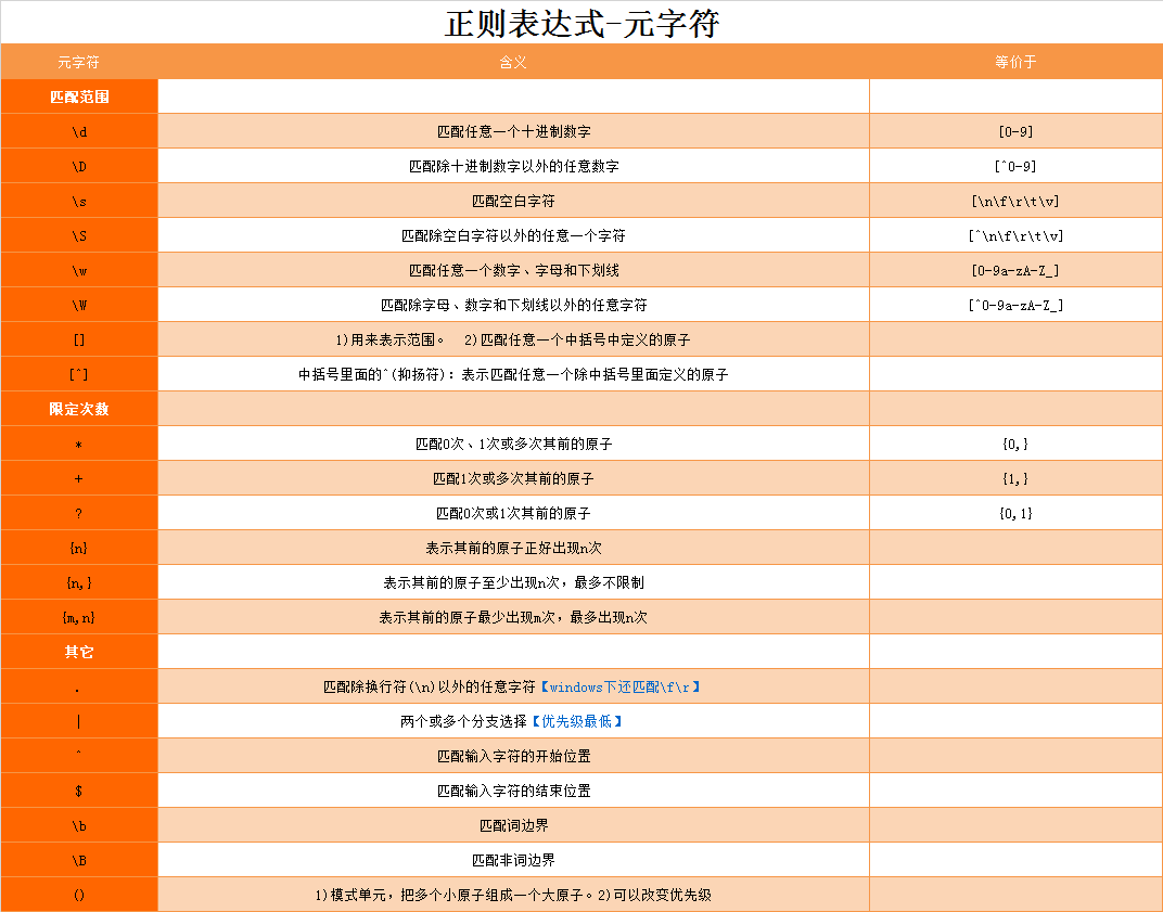 解答:操作符。例如:元字符: * #0个、1个或多个 + #1个或多个 ? #0个或1个 | #或 \b #词边界 \B #非词边界 {3} #3个 {3,7} #3个到7个 {3,} #3个以上 ^ #以什么开始 $ #以什么结尾 。