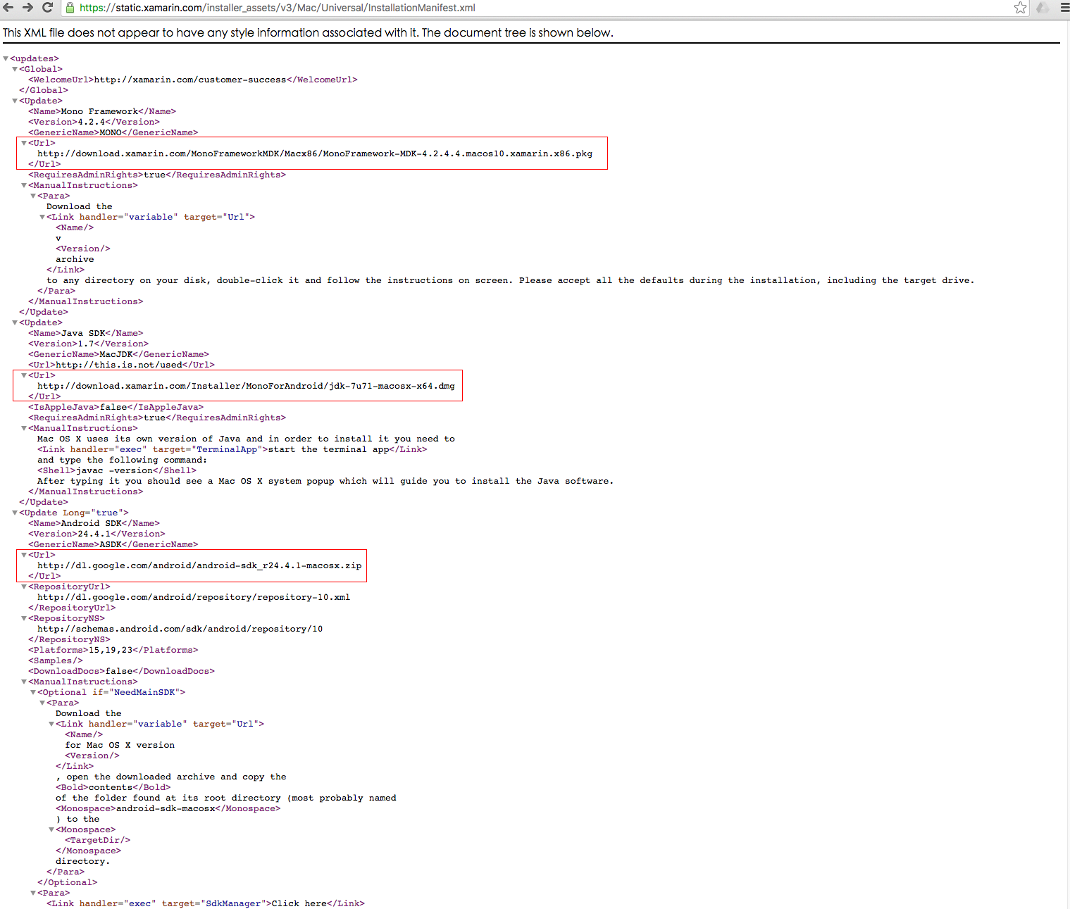 先讲讲安装吧,最普遍的方法就是去Xamarin官网,注册个账号,填写信息啥的开始下载,安装。但,在天朝的网络环境下,在下载android模块的东东时,总会下载失败,但你又没办法跳过。我曾经挂了一个晚上去下载,抱着晚上网络质量应该好点的自我安慰侥幸心理,结果第二天早上来的时候发现,还是下载失败。为了避免各位新人再入坑,和大家说下另外一个下载方法,用Google搜索 xamarin studio download xml,进入网站 https://static.xamarin.com/installer_assets/v3/Mac/Universal/InstallationManifest.xml 中,找链接,分批下载,安装。下面截个图说明下: