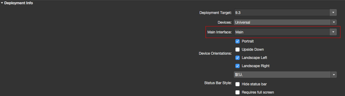 首先我们来讲第一种方式,利用storyboard进行布局。新建的项目,默认是storyboard方式的布局。我们所看到的一片白,就是Main.storyboard显示出来的。为什么会显示Main.storyboard上的布局呢,这和Info.plist中的设置有关,具体位置在下图中的红线标出来的位置。