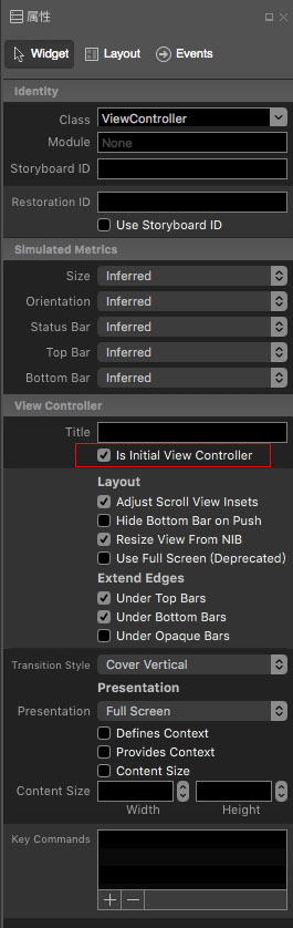 好,接下来,我们打开Main.storyboard文件,如下左图所示,其中红色矩形框出来的箭头,可以理解为起点,该箭头指向某个ViewController,APP就会以该ViewController作为LaunchScreen后首先显示的页面,设置的方式有两种,一种简单粗暴,直接拖拽;一种设置属性,选择ViewController,勾选下面右图红框内的属性即可。