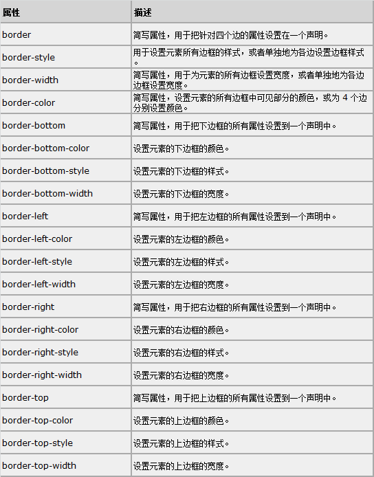 <html> <head> <style type="text/css"> p.one { border-style: solid; border-color: #0000ff } p.two { border-style: solid; border-color: #ff0000 #0000ff } p.three { border-style: solid; border-color: #ff0000 #00ff00 #0000ff } p.four { border-style: solid; border-color: #ff0000 #00ff00 #0000ff rgb(250,0,255) } </style> </head> <body> <p class="one">One-colored border!</p> <p class="two">Two-colored border!</p> <p class="three">Three-colored border!</p> <p class="four">Four-colored border!</p> <p><b>注释:</b>"border-width" 属性如果单独使用的话是不会起作用的。请首先使用 "border-style" 属性来设置边框。</p> </body> </html>