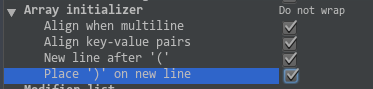 找到如下行 , 把钩打上即可 ,然后所有的换行就不会按CODESTYLE来格式化了这里全部是调节数组的 ,建议全部打钩