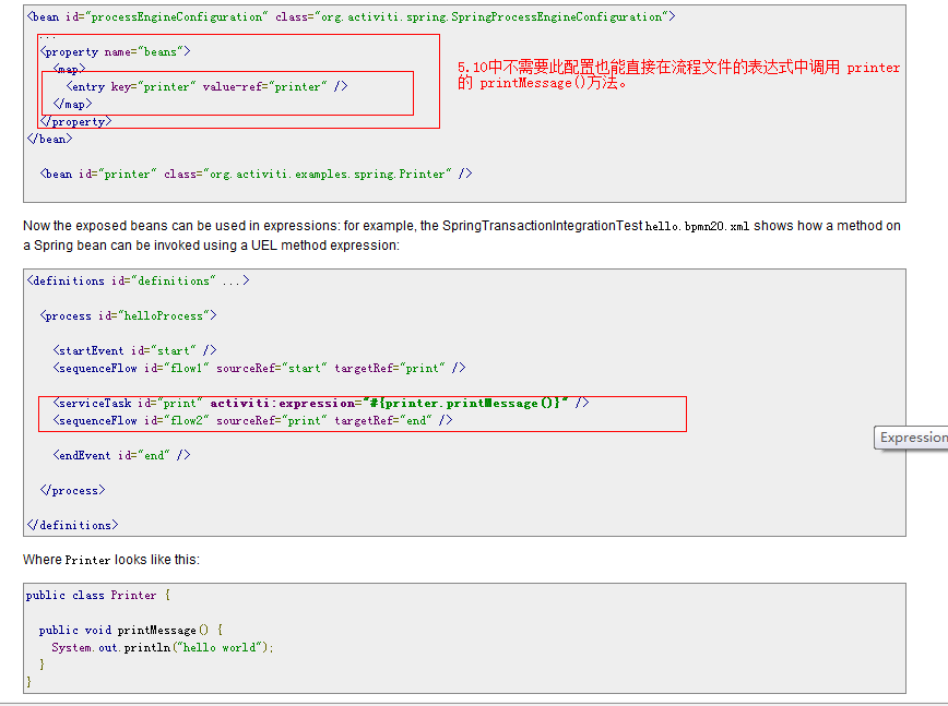 Activiti 5.10 相对以前的版本有了很大变动。在官方提供的 开发指南中,要在 bean.xml 中 要配置 beans 子属性才能在流程文件中的表达式中调用 bean 对象的方法。
