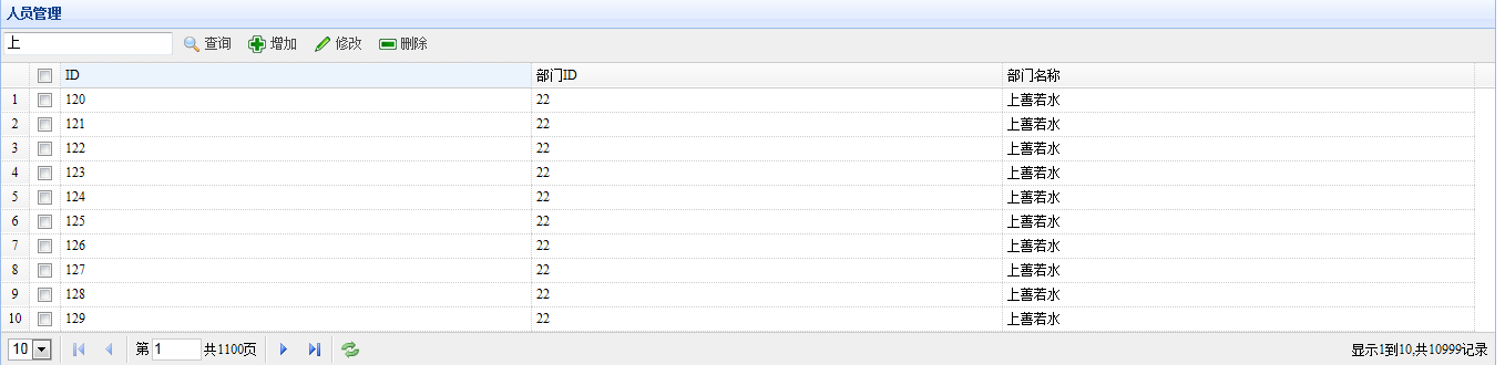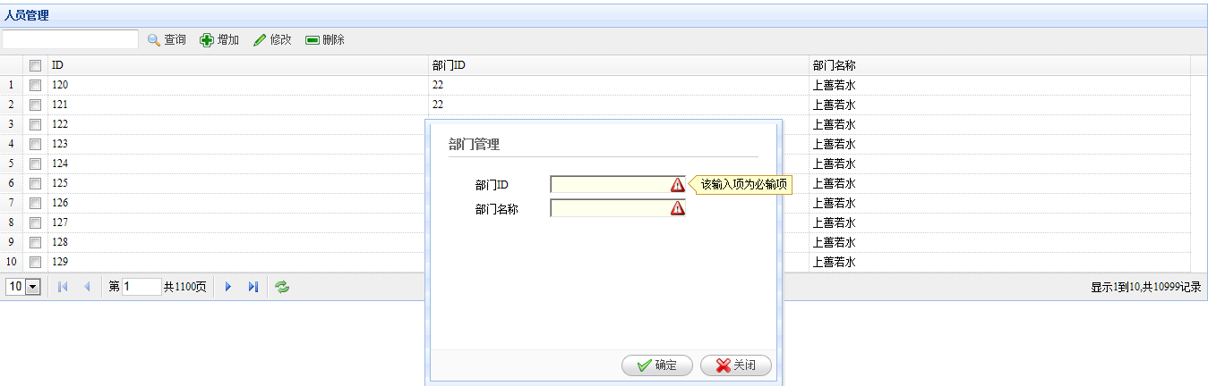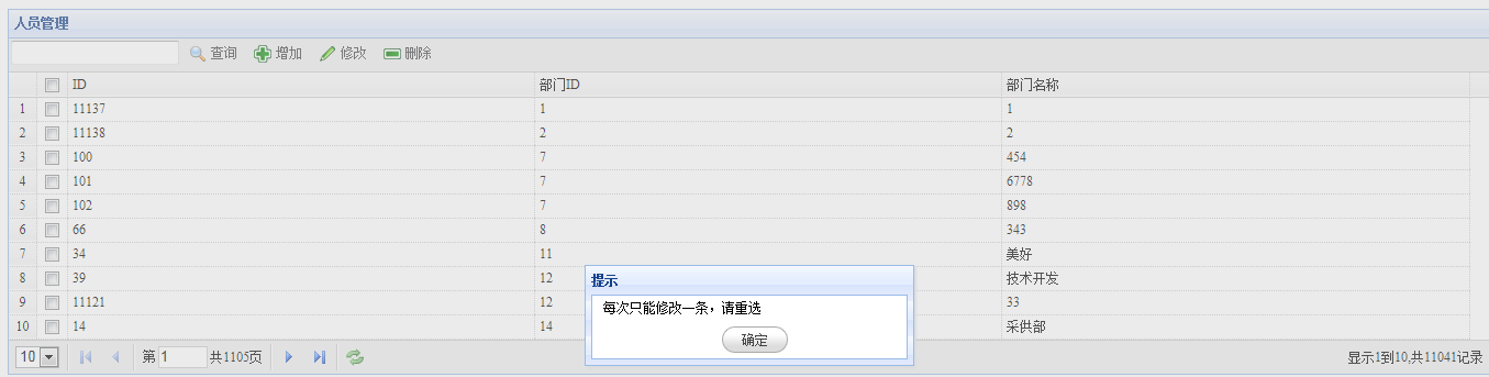 <head runat="server"> <title>Index</title> <!--引用所有的Jquery,easyUI文件 !--> <link rel="stylesheet" type="text/css" href="http://www.cnblogs.com/easyui/themes/default/easyui.css" /> <link rel="stylesheet" type="text/css" href="http://www.cnblogs.com/easyui/themes/icon.css" /> <script type="text/javascript" src="http://www.cnblogs.com/Scripts/jquery-1.4.1.min.js"></script> <script type="text/javascript" src="http://www.cnblogs.com/easyui/jquery.easyui.min.js"></script> <script type="text/javascript" src="http://www.cnblogs.com/easyui/locale/easyui-lang-zh_CN.js"></script> <style type="text/css"> #fm{ margin:0; padding:10px 30px; } .ftitle{ font-size:14px; font-weight:bold; color:#666; padding:5px 0; margin-bottom:10px; border-bottom:1px solid #ccc; } .fitem{ margin-bottom:5px; } .fitem label{ display:inline-block; width:80px; } </style> <script type="text/javascript"> //条件查询 function check() { var keywords = $("#SSID").val(); $('#dg').datagrid('load', { DepName: keywords }); } //添加信息 var url; function newUser() { $('#dlg').dialog('open').dialog('setTitle', '添加'); $('#fm').form('clear'); url = '/Home/Save/'; } //修改信息 function editUser() { var row = $('#dg').datagrid('getSelections'); if (row.length == 1) { if (row[0]) { $('#dlg').dialog('open').dialog('setTitle', '修改'); $('#fm').form('load', row[0]); url = '/Home/Update/' + row.Id; } } else { $.messager.alert("提示", "每次只能修改一条,请重选"); return; } } function saveUser() { $('#fm').form('submit', { url: url, onSubmit: function () { return $(this).form('validate'); }, success: function (result) { var result = eval('(' + result + ')'); if (result.success) { $('#dlg').dialog('close'); // 关闭弹出框 $('#dg').datagrid('reload'); // reload the user data $.messager.alert("操作", "操作成功!"); } else { $.messager.alert("操作", "操作失败!"); return; } } }); } function removeUser() { var row = $('#dg').datagrid('getSelections'); if (!row || row.length == 0) { $.messager.alert('提示', '请选择要删除的数据'); return; } var parm; $.each(row, function (i, n) { if (i == 0) { parm = n.Id; } else { parm += "," + n.Id; } }); // alert(parm); if (row) { $.messager.confirm('删除信息', '您确定删除此条信息吗?', function (r) { if (r) { $.post('/Home/Delete/', { idList: parm }, function (result) { if (result.success) { $('#dg').datagrid('reload'); // reload the user data $.messager.alert("提示", "删除成功!"); } else { $.messager.alert('提示', '删除失败,请检查!'); return; } }, 'json'); } }); } } </script> </head> <body> <div> <table id="dg" title="人员管理" class="easyui-datagrid" fit="True" url="/Home/LoadAllByPage/" toolbar="#toolbar" pagination="true" rownumbers="true" fitColumns="true" sortName= "DepID" > <thead> <tr> <th checkbox="true" field="Cid"/> <th field="Id" sortable="true" width="50">ID</th> <th field="DepID" sortable="true" width="50">部门ID</th> <th field="DepName" sortable="true" width="50">部门名称</th> </tr> </thead> </table> <div id="toolbar"> <input type="text" name="SSID" id="SSID" /> <a href="javascript:void(0)" class="easyui-linkbutton" iconCls="icon-search" plain="true" onclick="check()">查询</a> <a href="javascript:void(0)" class="easyui-linkbutton" iconCls="icon-add" plain="true" onclick="newUser()">增加</a> <a href="javascript:void(0)" class="easyui-linkbutton" iconCls="icon-edit" plain="true" onclick="editUser()">修改</a> <a href="javascript:void(0)" class="easyui-linkbutton" iconCls="icon-remove" plain="true" onclick="removeUser()">删除</a> </div> <!--弹出框的显示!--> <div id="dlg" class="easyui-dialog" style="width:400px;height:300px;padding:10px 20px" closed="true" buttons="#dlg-buttons"> <div class="ftitle">部门管理</div> <form id="fm" method="post" novalidate> <div class="fitem"> <input type="hidden" id="Id" name="Id" /> <label>部门ID</label> <input id="DepID" name="DepID" class="easyui-validatebox" required="true" /> </div> <div class="fitem"> <label>部门名称</label> <input id="DepName" name="DepName" class="easyui-validatebox" required="true" /> </div> </form> </div> <div id="dlg-buttons"> <a href="javascript:void(0)" class="easyui-linkbutton" iconCls="icon-ok" onclick="saveUser()">确定</a> <a href="javascript:void(0)" class="easyui-linkbutton" iconCls="icon-cancel" onclick="javascript:$('#dlg').dialog('close')">关闭</a> </div> </div> </body>