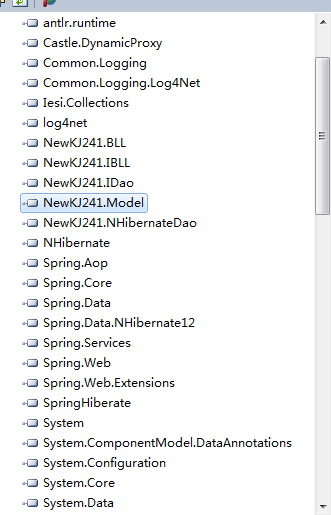 (2) 因为用到了Nhibernate,Spring.net,所以我将引入的DLL文件的截图先放在这里吧,当然,我的项目中有dll文件夹,这样将这里面的DLL全部引入项目中即可。