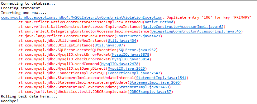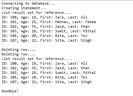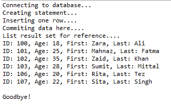 //STEP 1. Import required packages import java.sql.*; public class JDBCExample { // JDBC driver name and database URL static final String JDBC_DRIVER = "com.mysql.jdbc.Driver"; static final String DB_URL = "jdbc:mysql://localhost/Test?serverTimezone=UTC"; // Database credentials static final String USER = "root"; static final String PASS = "root"; public static void main(String[] args) { Connection conn = null; Statement stmt = null; try { // STEP 2: Register JDBC driver Class.forName("com.mysql.jdbc.Driver"); // STEP 3: Open a connection System.out.println("Connecting to database..."); conn = DriverManager.getConnection(DB_URL, USER, PASS); // STEP 4: Set auto commit as false. conn.setAutoCommit(false); // STEP 5: Execute a query to create statment with // required arguments for RS example. System.out.println("Creating statement..."); stmt = conn.createStatement(ResultSet.TYPE_SCROLL_INSENSITIVE, ResultSet.CONCUR_UPDATABLE); // STEP 6: INSERT a row into Employees table System.out.println("Inserting one row...."); String SQL = "INSERT INTO Employees " + "VALUES (106, 20, 'Rita', 'Tez')"; stmt.executeUpdate(SQL); // STEP 7: INSERT one more row into Employees table SQL = "INSERT INTO Employees " + "VALUES (107, 22, 'Sita', 'Singh')"; stmt.executeUpdate(SQL); // STEP 8: Commit data here. System.out.println("Commiting data here...."); conn.commit(); // STEP 9: Now list all the available records. String sql = "SELECT id, first, last, age FROM Employees"; ResultSet rs = stmt.executeQuery(sql); System.out.println("List result set for reference...."); printRs(rs); // STEP 10: Clean-up environment rs.close(); stmt.close(); conn.close(); } catch (SQLException se) { // Handle errors for JDBC se.printStackTrace(); // If there is an error then rollback the changes. System.out.println("Rolling back data here...."); try { if (conn != null) conn.rollback(); } catch (SQLException se2) { se2.printStackTrace(); } // end try } catch (Exception e) { // Handle errors for Class.forName e.printStackTrace(); } finally { // finally block used to close resources try { if (stmt != null) stmt.close(); } catch (SQLException se2) { } // nothing we can do try { if (conn != null) conn.close(); } catch (SQLException se) { se.printStackTrace(); } // end finally try } // end try System.out.println("Goodbye!"); }// end main public static void printRs(ResultSet rs) throws SQLException { // Ensure we start with first row rs.beforeFirst(); while (rs.next()) { // Retrieve by column name int id = rs.getInt("id"); int age = rs.getInt("age"); String first = rs.getString("first"); String last = rs.getString("last"); // Display values System.out.print("ID: " + id); System.out.print(", Age: " + age); System.out.print(", First: " + first); System.out.println(", Last: " + last); } System.out.println(); }// end printRs() }// end JDBCExample