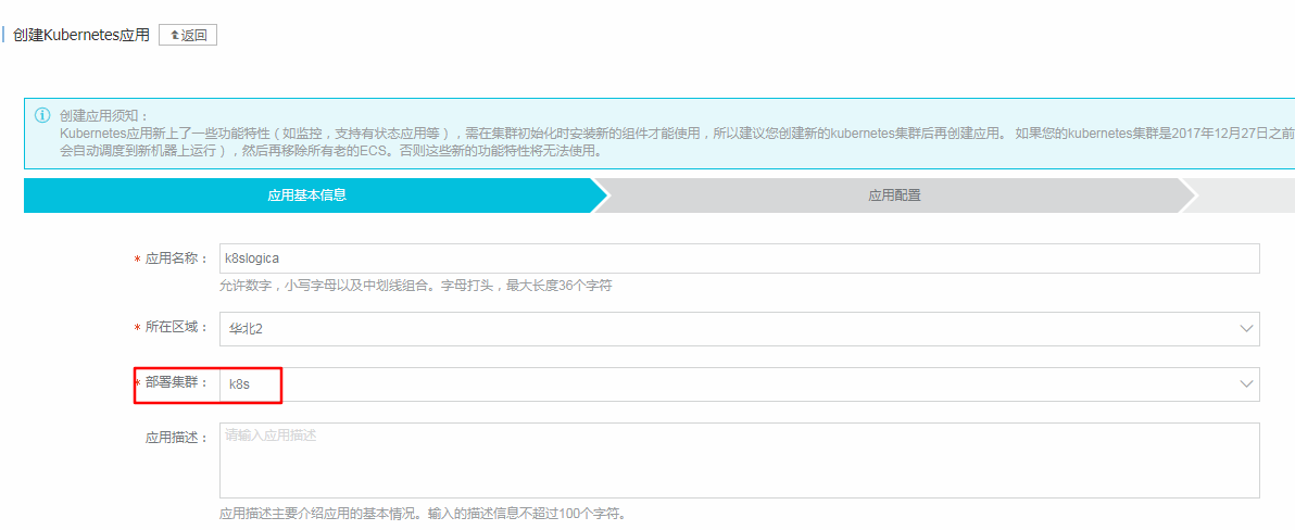 5.创建k8s应用,在这里,我们不会看到有ECS的实例信息,K8S是通过集群部署的,所以只有选择具体的地域和集群