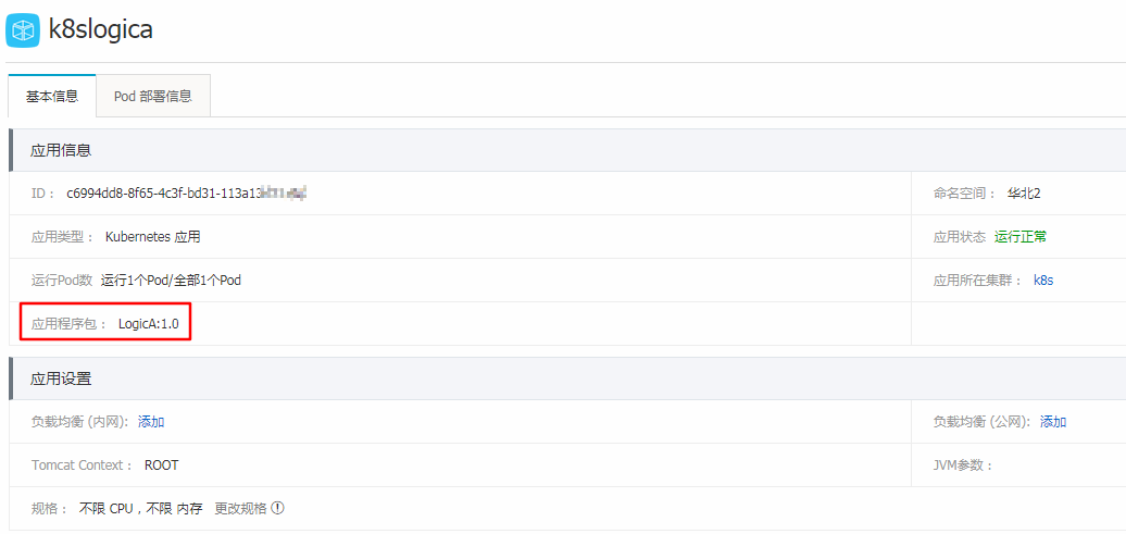 这个时候,我们看到的应用程序包为我们上传的war包“LogicA”,版本为1.0,应用已经创建完毕。