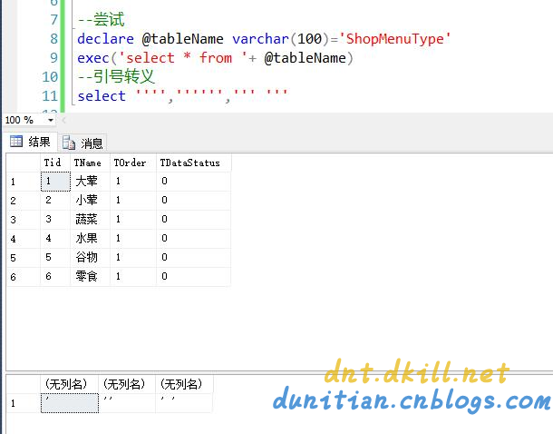 select @tableName='ShopMenuType',@cloumnName='TName'--每次替换这里的表名和列名就可以了