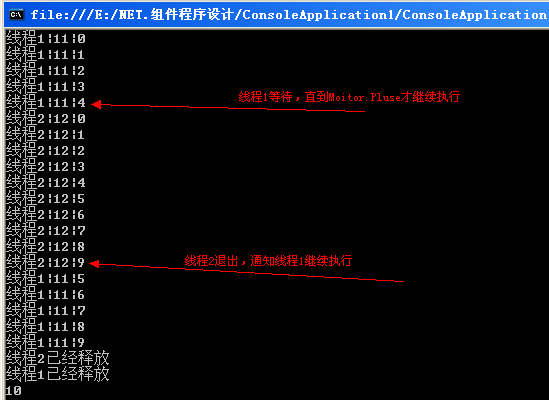 在ShowMessage里面我用Monitor.Wait方法等待,当调用这个方法的时候会使用我锁定的对象,让其他线程进入执行。当Monitor.Pluse的时候,线程1继续执行。