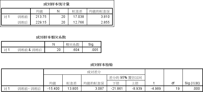 •由表可以看出,P<0.05,即训练前成绩与训练后成绩存在显著性差异。由此可见,这种训练方法确实能提高学生的下肢爆发力。