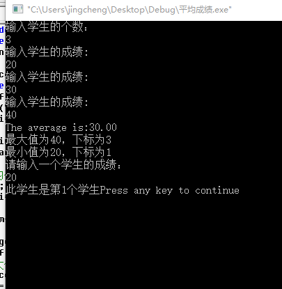 # include <stdio.h> # define N 100 int main () { int score [N] ,n,sum, i,max,min,index,grade,index1,index2; double average ; printf("输入学生的个数:\n"); scanf("%d",&n); for (i=0;i<n;i++) { printf("输入学生的成绩:\n"); scanf("%d",&score [i]); } //平均值 sum=0; for (i=0;i<n;i++) { sum+=score[i]; } average=(double)sum/n; printf ( "The average is:%.2f\n" , average ) ; //最大值 max=score[0]; index=0; for(i=0;i<n;i++) { if(score[i]>max) { max=score[i]; index=i; } } printf("最大值为%d,下标为%d\n",max,index+1); //最小值 min=score[0]; index1=0; for(i=0;i<n;i++) { if(score[i]<min) { min=score[i]; index1=i; } } printf("最小值为%d,下标为%d\n",min,index1+1); //学生位置 index2=0; printf("请输入一个学生的成绩:\n"); scanf("%d",&grade); for(i=0;i<n;i++) { if(grade==score[i]) { index2=i; printf("此学生是第%d个学生",index2+1); break; } } return 0; }