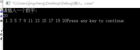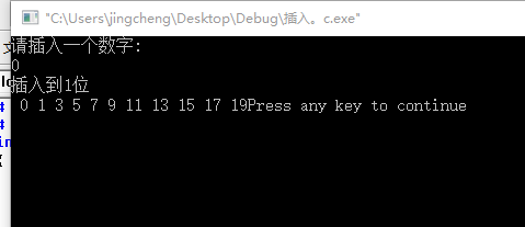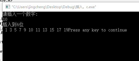 # include <stdio.h> # define N 11 int main () { int a,b,c,d,i; int scare [N]={1,3,5,7,9,11,13,15,17,19}; printf("请插入一个数字:\n"); scanf ("%d",&a); d=11; for (i=0;i<11;i++) { if (a<scare[i]) { d=i+1; printf("插入到%d位\n",d); break; } } for (i=d-1,c=N-1;i<=c;c--) { scare[c]=scare[c-1]; } scare[i]=a; for (i=0;i<N;i++) { printf(" %d",scare[i]); } return 0; }