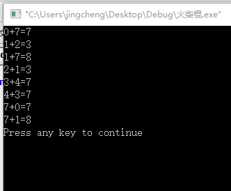 # include <stdio.h> int main () { int a,b,c,sum; int match[10]={6,2,5,5,4,5,6,3,7,6}; c=0; sum=0; for (a=0;a<=9;a++) for (b=0;b<=9;b++) { c=a+b; if(c>9) { break; } sum=match[a]+match[b]+match[c]; if (sum==12) { printf("%d+%d=%d\n",a,b,c); } } return 0; }