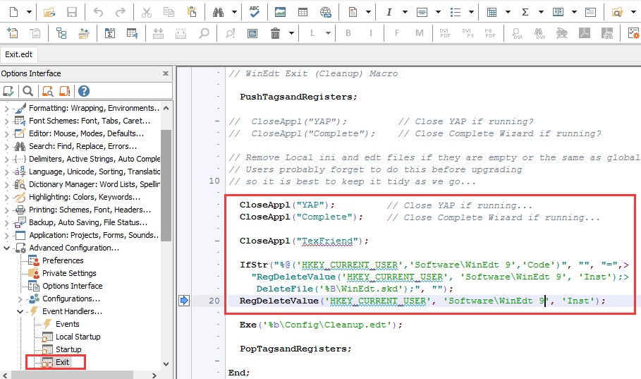 1 CloseAppl("YAP"); // Close YAP if running... 2 CloseAppl("Complete"); // Close Complete Wizard if running... 3 4 CloseAppl("TexFriend"); 5 6 IfStr("%@('HKEY_CURRENT_USER','Software\WinEdt 9','Code')", "", "=",> 7 "RegDeleteValue('HKEY_CURRENT_USER', 'Software\WinEdt 9', 'Inst');> 8 DeleteFile('%B\WinEdt.skd');", ""); 9 RegDeleteValue('HKEY_CURRENT_USER', 'Software\WinEdt 9', 'Inst');