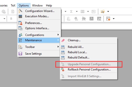 笔者从WinEdt官网下载了最新的9.1版本,然后安装到CTEX目录下的原WinEdt目录以覆盖旧版的WinEdt 7。新版WinEdt的一个好处是支持高分辨率屏幕,例如surface、surface pro等。安装完后运行WinEdt会提示需要更新configuration,操作如下(提示窗口中也有给出):