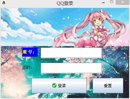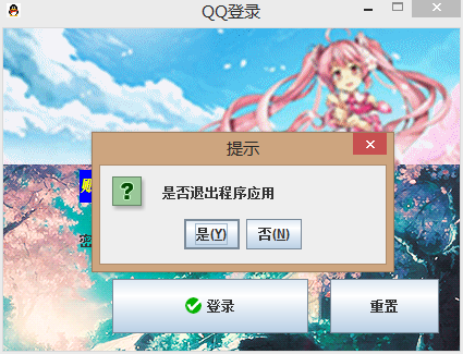 1 import java.awt.*; 2 import javax.swing.*; 3 import javax.swing.JFrame; 4 import java.awt.event.WindowListener; 5 import java.awt.event.WindowEvent; 6 import java.awt.event.WindowAdapter; 7 import java.awt.event.ActionListener; 8 import java.awt.event.ActionEvent; 9 class QQ extends JFrame //继承JFrame 10 { 11 QQ() //构造函数 12 { 13 display();//调用display()函数 14 } 15 JButton btn1; 16 JButton btn2; 17 JTextField jtf1; 18 JPasswordField jpf1; //密码文本 19 class MyListener extends WindowAdapter //适配器 是扩展 不需要覆盖WindowAdapter中的所有方法 功能代码较多 20 { 21 public void windowClosing(WindowEvent e) 22 { 23 System.out.println("windowClosing"); 24 int res = JOptionPane.showConfirmDialog(null,"是否退出程序应用","提示", JOptionPane.YES_NO_OPTION); //弹出消息框 25 System.out.println("res =" + res); 26 if(res == 0) 27 { 28 System.out.println("退出"); 29 System.exit(1);// 退出 30 System.out.println("退出1"); //不输出 因为exit先执行 31 } 32 else if(res == 1) 33 { 34 System.out.println("不退出"); 35 setDefaultCloseOperation(JFrame.DO_NOTHING_ON_CLOSE); 36 //System.exit(1);// 退出 37 // 不退出 38 } 39 } 40 } 41 class BtnAction implements ActionListener //btn事件 42 { 43 public void actionPerformed(ActionEvent e) 44 { 45 System.out.println("actionPerformed"); 46 if(jtf1.getText().equals("jk") && jpf1.getText().equals("jk")) 47 { 48 System.out.println("OK"); 49 dispose(); 50 (new JFrame("主窗口")).setVisible(true); 51 } 52 else 53 { 54 System.out.println("Error"); 55 JOptionPane.showConfirmDialog(null,"密码错误","提示", JOptionPane.DEFAULT_OPTION); 56 } 57 } 58 } 59 class BtnAction2 implements ActionListener //内部类 60 { 61 public void actionPerformed(ActionEvent e) 62 { 63 Object o = e.getSource(); 64 JButton b = (JButton)o; //强制类型转换 65 System.out.println("芝麻开门" + btn2.getText()); //类的成员/函数,可以在内部类中使用 66 67 if(b == btn2) //b.getSource == "注册" 68 { 69 jtf1.setText(""); 70 jpf1.setText(""); 71 } 72 } 73 } 74 public void display() 75 { 76 //JFrame frm = new JFrame(); //窗体 77 ImageIcon img1 = new ImageIcon("timg.gif"); //背景 78 JLabel background1 = new JLabel(img1); 79 this.getLayeredPane().add(background1, new Integer(Integer.MIN_VALUE)); 80 //background.setBounds(0, 0, img.getIconWidth(), img.getIconHeight()); 81 background1.setBounds(0, 0, 425, 450); 82 ImageIcon img2 = new ImageIcon("33.gif"); 83 JLabel background2 = new JLabel(img2); 84 this.getLayeredPane().add(background2, new Integer(Integer.MIN_VALUE)); 85 background2.setBounds(0, 0, img2.getIconWidth(), img2.getIconHeight()); 86 87 jtf1 = new JTextField(30); //文本 88 //jtf1.setColumns(10); 89 jtf1.setSize(200,35); 90 jtf1.setLocation(130,130); 91 jpf1 = new JPasswordField(30); //密码文本 92 //jpf1.setEchoChar('#'); 设置密码文本内容 93 jpf1.setSize(200,35); 94 jpf1.setLocation(130,180); 95 96 JLabel lab1 = new JLabel("账号:"); //标题 97 Font fnt = new Font("Serief",Font.ITALIC+Font.BOLD,15); 98 lab1.setFont(fnt); 99 lab1.setBackground(Color.BLUE); //label的背景颜色 100 lab1.setOpaque(true); //label是否透明 101 lab1.setForeground(Color.YELLOW); //label前景色 102 JLabel lab2 = new JLabel("密码:"); 103 lab1.setSize(50,30); 104 lab2.setSize(50,30); 105 lab1.setLocation(70,130); 106 lab2.setLocation(70,180); 107 btn1 = new JButton("登录"); 108 btn1.setBounds(100,230,180,50); 109 Image im1 = (new ImageIcon("QQ.png")).getImage(); //图标 110 this.setIconImage(im1); 111 //ImageIcon im2 = new ImageIcon("77.png"); //图标 112 ImageIcon im2 = new ImageIcon("./77.png"); 113 btn1.setIcon(im2); 114 this.setLayout(null); //布局--绝对布局 115 MyListener ltn = new MyListener(); //监听 116 this.addWindowListener(ltn); 117 BtnAction act = new BtnAction(); //btn事件 118 btn1.addActionListener(act); 119 btn2 = new JButton("重置"); 120 btn2.setBounds(300,230,100,50); 121 BtnAction2 act2 = new BtnAction2(); 122 btn2.addActionListener(act2); 123 //frm.setDefaultCloseOperation(JFrame.EXIT_ON_CLOSE); 124 this.setSize(425,325); 125 this.setLocation(700,500); 126 this.setTitle("QQ登录"); 127 this.setResizable(false); 128 this.add(btn1); 129 this.add(btn2); 130 this.add(lab1); 131 this.add(lab2); 132 this.add(jpf1); 133 this.add(jtf1); 134 this.add(background1); 135 this.add(background2); 136 this.setVisible(true); 137 System.out.println("OK"); 138 } 139 public static void main(String[] args) 140 { 141 QQ Event1 = new QQ(); 142 System.out.println("OK"); 143 } 144 }