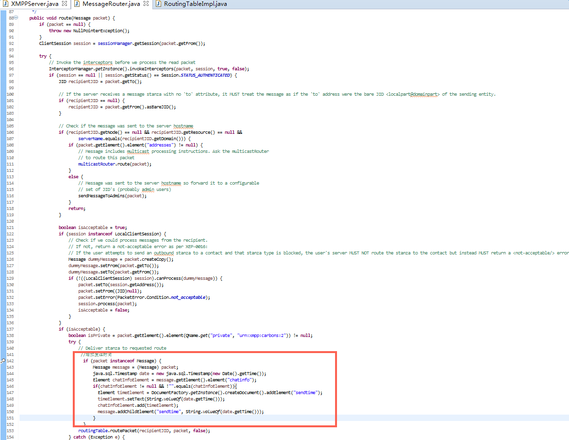 /** * $RCSfile: MessageRouter.java,v $ * $Revision: 3007 $ * $Date: 2005-10-31 13:29:25 -0300 (Mon, 31 Oct 2005) $ * * Copyright (C) 2005-2008 Jive Software. All rights reserved. * * Licensed under the Apache License, Version 2.0 (the "License"); * you may not use this file except in compliance with the License. * You may obtain a copy of the License at * * http://www.apache.org/licenses/LICENSE-2.0 * * Unless required by applicable law or agreed to in writing, software * distributed under the License is distributed on an "AS IS" BASIS, * WITHOUT WARRANTIES OR CONDITIONS OF ANY KIND, either express or implied. * See the License for the specific language governing permissions and * limitations under the License. */ package org.jivesoftware.openfire; import java.util.Date; import java.util.List; import java.util.StringTokenizer; import org.dom4j.DocumentFactory; import org.dom4j.Element; import org.dom4j.QName; import org.jivesoftware.openfire.carbons.Sent; import org.jivesoftware.openfire.container.BasicModule; import org.jivesoftware.openfire.forward.Forwarded; import org.jivesoftware.openfire.interceptor.InterceptorManager; import org.jivesoftware.openfire.interceptor.PacketRejectedException; import org.jivesoftware.openfire.session.ClientSession; import org.jivesoftware.openfire.session.LocalClientSession; import org.jivesoftware.openfire.session.Session; import org.jivesoftware.openfire.user.UserManager; import org.jivesoftware.util.JiveGlobals; import org.slf4j.Logger; import org.slf4j.LoggerFactory; import org.xmpp.packet.JID; import org.xmpp.packet.Message; import org.xmpp.packet.Packet; import org.xmpp.packet.PacketError; /** * <p>Route message packets throughout the server.</p> * <p>Routing is based on the recipient and sender addresses. The typical * packet will often be routed twice, once from the sender to some internal * server component for handling or processing, and then back to the router * to be delivered to it's final destination.</p> * * @author Iain Shigeoka */ public class MessageRouter extends BasicModule { private static Logger log = LoggerFactory.getLogger(MessageRouter.class); private OfflineMessageStrategy messageStrategy; private RoutingTable routingTable; private SessionManager sessionManager; private MulticastRouter multicastRouter; private UserManager userManager; private String serverName; /** * Constructs a message router. */ public MessageRouter() { super("XMPP Message Router"); } /** * <p>Performs the actual packet routing.</p> * <p>You routing is considered 'quick' and implementations may not take * excessive amounts of time to complete the routing. If routing will take * a long amount of time, the actual routing should be done in another thread * so this method returns quickly.</p> * <h2>Warning</h2> * <p>Be careful to enforce concurrency DbC of concurrent by synchronizing * any accesses to class resources.</p> * * @param packet The packet to route * @throws NullPointerException If the packet is null */ public void route(Message packet) { if (packet == null) { throw new NullPointerException(); } ClientSession session = sessionManager.getSession(packet.getFrom()); try { // Invoke the interceptors before we process the read packet InterceptorManager.getInstance().invokeInterceptors(packet, session, true, false); if (session == null || session.getStatus() == Session.STATUS_AUTHENTICATED) { JID recipientJID = packet.getTo(); // If the server receives a message stanza with no 'to' attribute, it MUST treat the message as if the 'to' address were the bare JID <localpart@domainpart> of the sending entity. if (recipientJID == null) { recipientJID = packet.getFrom().asBareJID(); } // Check if the message was sent to the server hostname if (recipientJID.getNode() == null && recipientJID.getResource() == null && serverName.equals(recipientJID.getDomain())) { if (packet.getElement().element("addresses") != null) { // Message includes multicast processing instructions. Ask the multicastRouter // to route this packet multicastRouter.route(packet); } else { // Message was sent to the server hostname so forward it to a configurable // set of JID's (probably admin users) sendMessageToAdmins(packet); } return; } boolean isAcceptable = true; if (session instanceof LocalClientSession) { // Check if we could process messages from the recipient. // If not, return a not-acceptable error as per XEP-0016: // If the user attempts to send an outbound stanza to a contact and that stanza type is blocked, the user's server MUST NOT route the stanza to the contact but instead MUST return a <not-acceptable/> error Message dummyMessage = packet.createCopy(); dummyMessage.setFrom(packet.getTo()); dummyMessage.setTo(packet.getFrom()); if (!((LocalClientSession) session).canProcess(dummyMessage)) { packet.setTo(session.getAddress()); packet.setFrom((JID)null); packet.setError(PacketError.Condition.not_acceptable); session.process(packet); isAcceptable = false; } } if (isAcceptable) { boolean isPrivate = packet.getElement().element(QName.get("private", "urn:xmpp:carbons:2")) != null; try { // Deliver stanza to requested route //增加发送时间 if (packet instanceof Message) { Message message = (Message) packet; java.sql.Timestamp date = new java.sql.Timestamp(new Date().getTime()); Element chatInfoElement = message.getElement().element("chatinfo"); if(chatInfoElement != null && !"".equals(chatInfoElement)){ Element timeElement = DocumentFactory.getInstance().createDocument().addElement("sendtime"); timeElement.setText(String.valueOf(date.getTime())); chatInfoElement.add(timeElement); message.addChildElement("sendtime", String.valueOf(date.getTime())); } } routingTable.routePacket(recipientJID, packet, false); } catch (Exception e) { log.error("Failed to route packet: " + packet.toXML(), e); routingFailed(recipientJID, packet); } // Sent carbon copies to other resources of the sender: // When a client sends a <message/> of type "chat" if (packet.getType() == Message.Type.chat && !isPriva