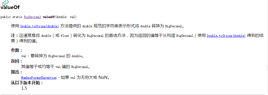 BigDecimal public BigDecimal(String val) 将 BigDecimal 的字符串表示形式转换为 BigDecimal。字符串表示形式由可选符号 '+' ( '\u002B') 或 '-' ( '\u002D') 组成,后跟零或多个十进制数字(“整数”)的序列,可以选择后跟一个小数,也可以选择后跟一个指数。 该小数由小数点以及后跟的零或更多十进制数字组成。字符串必须至少包含整数或小数部分中的一个数字。由符号、整数和小数部分组成的数字称为有效位数。 指数由字符 'e'('\u0065') 或 'E' ('\u0045') 以及后跟的一个或多个十进制数字组成。指数的值必须位于 Integer.MAX_VALUE (Integer.MIN_VALUE+1) 和 Integer.MAX_VALUE(包括)之间。 更正式地说,以下语法描述了此构造方法接受的字符串: BigDecimalString: Signopt Significand Exponentopt Sign: + - Significand: IntegerPart . FractionPartopt . FractionPart IntegerPart IntegerPart: Digits FractionPart: Digits Exponent: ExponentIndicator SignedInteger ExponentIndicator: e E SignedInteger: Signopt Digits Digits: Digit Digits Digit Digit: Character.isDigit(char) 对其返回 true 的任何字符,如 0、1、2…… 返回的 BigDecimal 的标度将是小数部分中的数字位数,如果该字符串不包含小数点,则标度为零,这取决于对指数的调整;如果字符串包含一个指数,则从标度减去该指数。得到的标度值必须位于 Integer.MIN_VALUE 和 Integer.MAX_VALUE(包括)之间。 Character.digit(char, int) 集提供从字符到数字的映射,以转换成基数 10。该字符串不能包含任何额外字符(例如,空白)。 示例: 返回的 BigDecimal 的值等于有效位数 × 10 指数。对于左边的每个字符串,得到的表示形式 [BigInteger, scale] 显示在右边。 "0" [0,0] "0.00" [0,2] "123" [123,0] "-123" [-123,0] "1.23E3" [123,-1] "1.23E+3" [123,-1] "12.3E+7" [123,-6] "12.0" [120,1] "12.3" [123,1] "0.00123" [123,5] "-1.23E-12" [-123,14] "1234.5E-4" [12345,5] "0E+7" [0,-7] "-0" [0,0] 注:对于不是 float、double NaN 和 ±Infinity 的值,此构造方法与 Float.toString(float) 和 Double.toString(double) 返回的值兼容。这通常是将 float 或 double 转换为 BigDecimal 的首选方法,因为它不会遇到 BigDecimal(double) 构造方法的不可预知问题。 参数: val - BigDecimal 的字符串表示形式。 抛出: NumberFormatException - 如果 val 不是 BigDecimal 的有效表示形式。