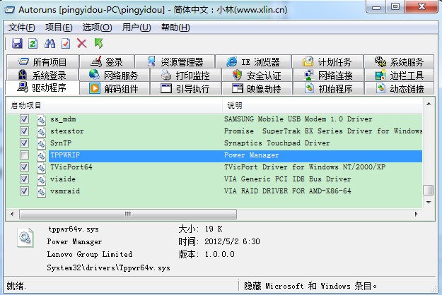 3、再用软件autorunschs.exe将电源管理驱动选设置为不启动(即在开机时不加载电源管理驱动)。