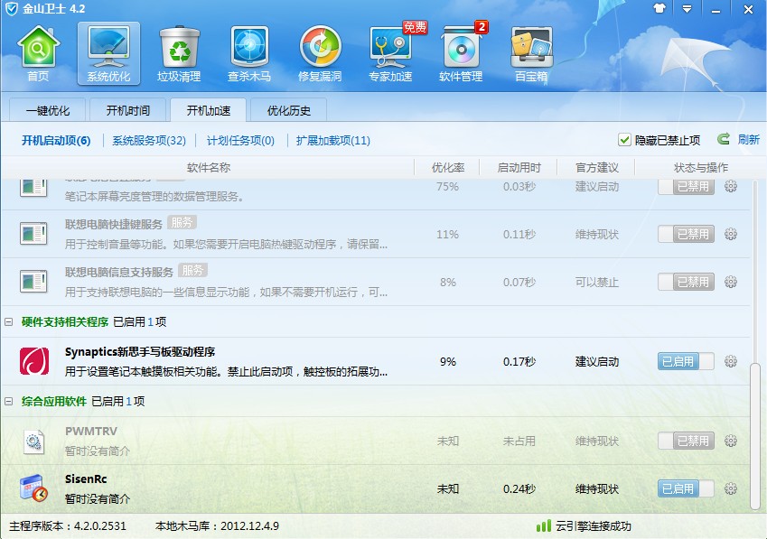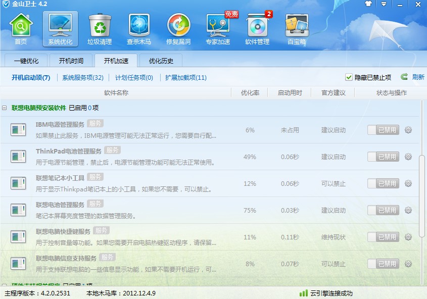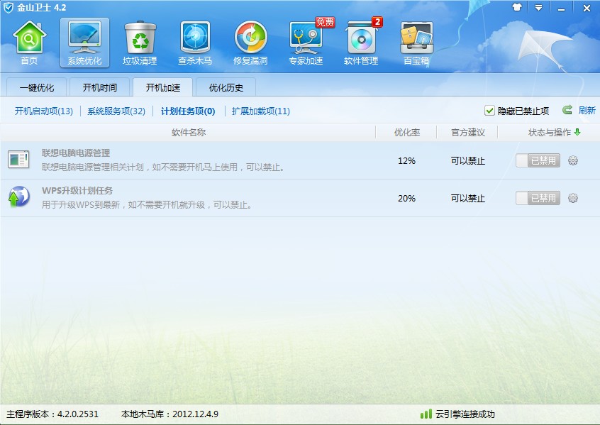 2、然后利用金山卫士将与电源管理有关的启动项以及计划任务都关掉。