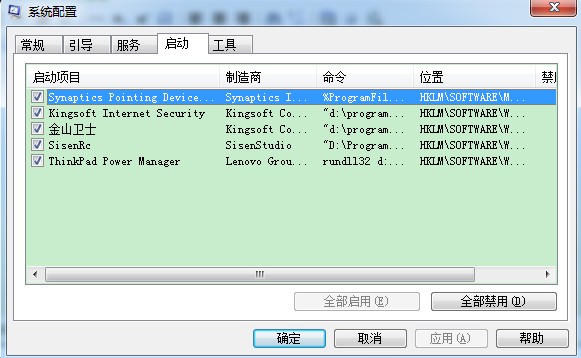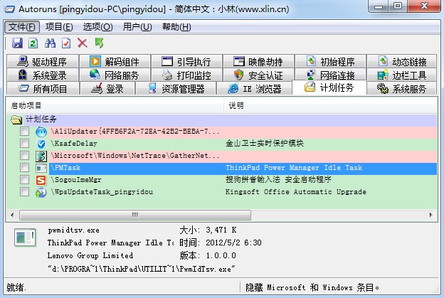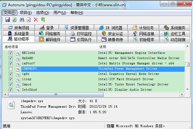 即将“驱动程序”选项下面的子项“IBMPMDRV”、"TPPWRIF"前面的勾去掉;“系统任务”选项下面与电源管理有关的子项的勾去掉(可能不去掉也可以,没做实验验证);“计划任务”选项下面与电源管理有关的子项的勾去掉;