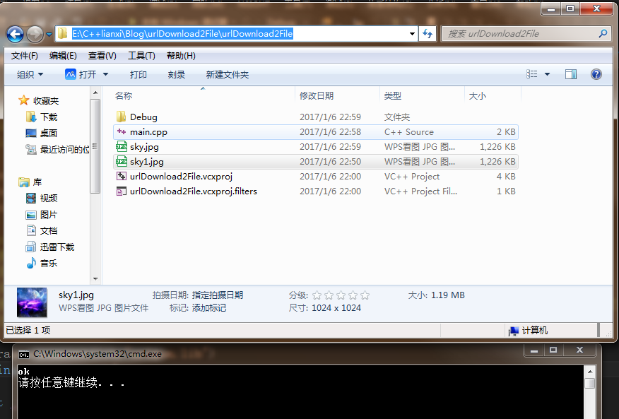 1 /* 2 @author:CodingMengmeng 3 @theme:C++根据图片url下载图片 4 @time:2017-1-6 22:58:00 5 @blog:http://www.cnblogs.com/codingmengmeng/ 6 */ 7 #include <tchar.h> 8 #include <iostream> 9 #include <urlmon.h> 10 /* 11 #pragma comment(lib,"urlmon.lib")作用: 12 连接静态库到项目中,效果等同于: 13 项目属性——链接器——输入——附加依赖项中加入这个lib 14 (头文件<urlmon.h>中只是包含了数据结构和函数声明,是编译阶段; 15 链接阶段将从静态库中恢复这些函数和数据并把他们和应用程序中的其它模块组合在一起生成可执行文件, 16 该过程称为“静态链接”) 17 */ 18 #pragma comment(lib,"urlmon.lib") 19 using namespace std; 20 21 int _tmain(int argc, char* argv[]) 22 { 23 string url = "http://pic104.nipic.com/file/20160715/6171480_185807154956_2.jpg"; 24 size_t len = url.length();//获取字符串长度 25 int nmlen = MultiByteToWideChar(CP_ACP, 0, url.c_str(), len + 1, NULL, 0);//如果函数运行成功,并且cchWideChar为零, 26 //返回值是接收到待转换字符串的缓冲区所需求的宽字符数大小。 27 wchar_t* buffer = new wchar_t[nmlen]; 28 MultiByteToWideChar(CP_ACP, 0, url.c_str(), len + 1, buffer, nmlen); 29 HRESULT hr = URLDownloadToFile(NULL, buffer,_T("E:\\C++lianxi\\Blog\\urlDownload2File\\urlDownload2File\\sky.jpg"), 0, NULL); 30 if (hr == S_OK) 31 { 32 cout << "ok" << endl; 33 } 34 return 0; 35 }