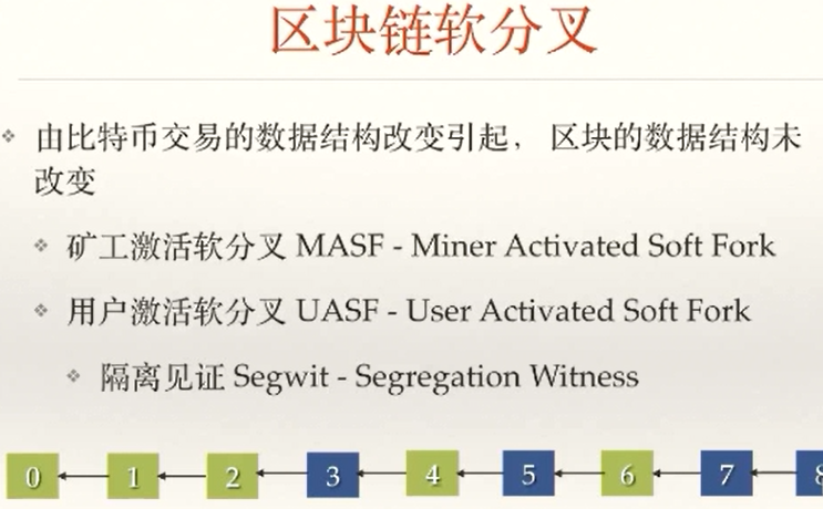 软分叉:由比特币交易的数据结构改变引起,区块的数据结构未改变。矿工激活软分叉,用户激活软分叉,隔离见证,扩容。