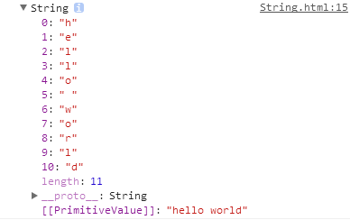 1 /***************************** 2 通过构造函数定义的字符串, 3 实际上可以叫做字符串对象, 4 在chorme中返回一个字符拆分的对象 5 */ 6 var str = new String("hello world"); 7 console.log(str);