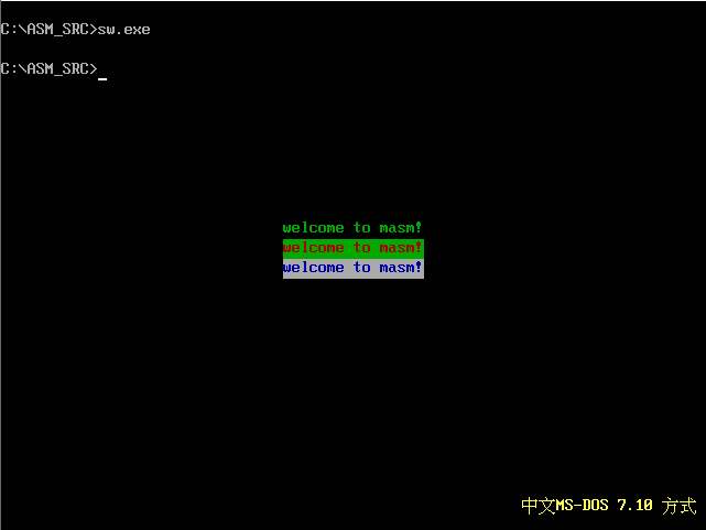 题目:在屏幕中间分别显示绿色、绿底红色、白底蓝色的字符串’welcome to masm!’.