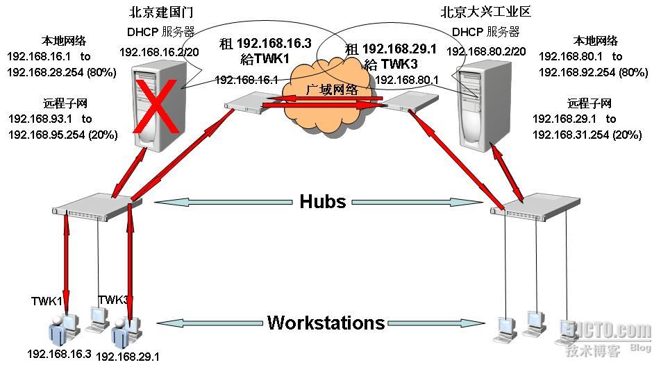 不过这样的网络设计也存在局限性。以北京建国门办公网络的DHCP服务器为例,如果它停机时间过长,它也许会耗尽北京大兴工业园区DHCP服务器的客户端租约,导致两地的客户端都不能续约。因此,作为负责80%的服务器应制定灾难恢复计划,将停机时间缩至最短。