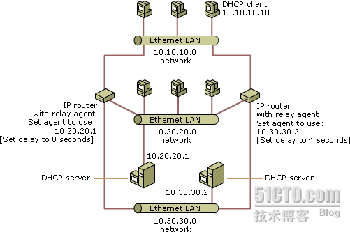 为获得最佳路由型 DHCP 网络性能,建议采用图3-42中继代理实现方法。使用连接于两个不同子网的两台 DHCP 服务器。在每个用于连接子网的路由器上运行的中继代理有不同的延迟间隔(一个设置为 4 秒,另一个不使用延迟)。它通过随机选择的网络路径排除了不希望出现的 DHCP 数据包溢出危险。