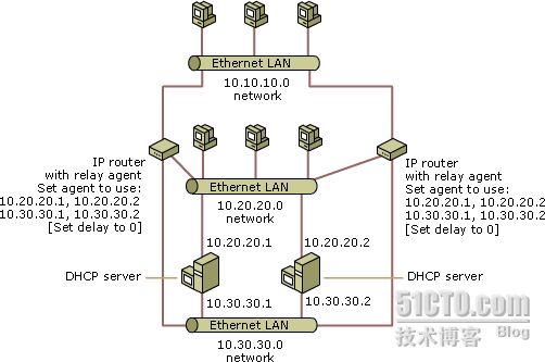 当你有多个 DHCP 服务器时,Microsoft 建议你将 DHCP 服务器置于不同的子网上而不是将所有的服务器置于一个子网上,以获得更强的容错能力。服务器在其作用域中不应有公用的 IP 地址(每个服务器应有唯一的地址池)。