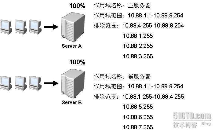 注意这是在同一子网网段上的范例,我想这个网络非常适用于100台左右的网络规模,这样的话每台服务器所能分配的地址空间是所需的1倍以上,而排除地址范围后,就能够实现Server A和Server B无缝配合了。