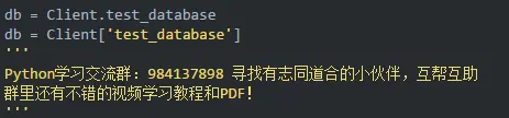 在MongoDB中一个实例能够支持多个独立的数据库,你可以用点取属性的方式来获取数据库,或者通过字典的方式获取:
