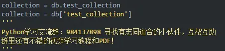 Collection是存储在MongoDB中的一组文件,同获取database一样,你可以用点取属性的方式或者字典的方法获取: