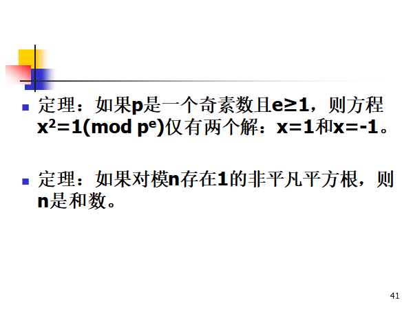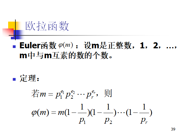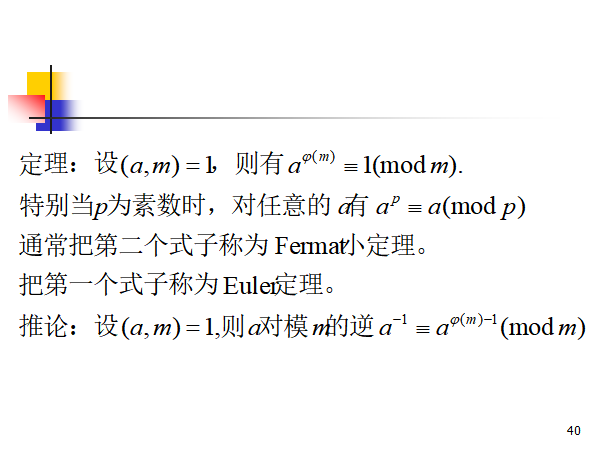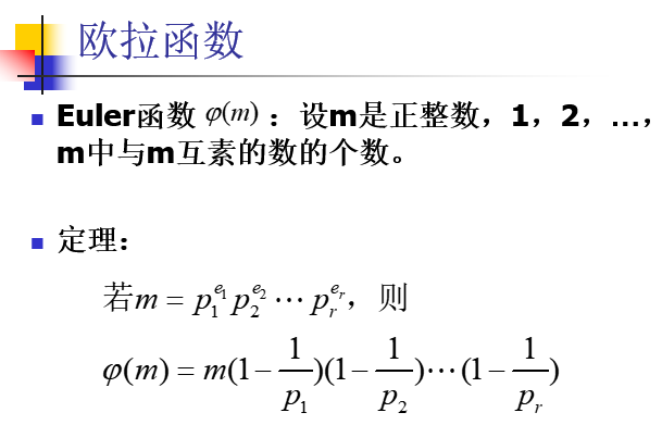 对于任何两个互质 的正整数a,n(n>2)有:a^φ(n)=1 mod n (恒等于)此公式即 欧拉定理