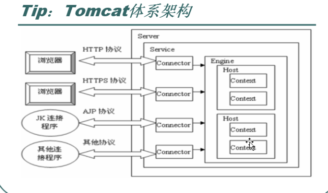 Tomcat服务器启动时,首先启动server,然后启动一个service,service里面有多个连接器,然后找到引擎,通过引擎找到那个主机(主机名是请求时携带的),然后找到某个应用。体系架构可以参考conf/server.xml