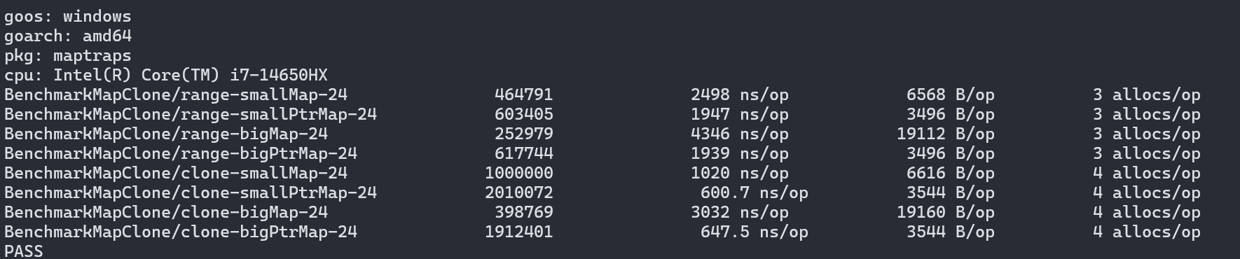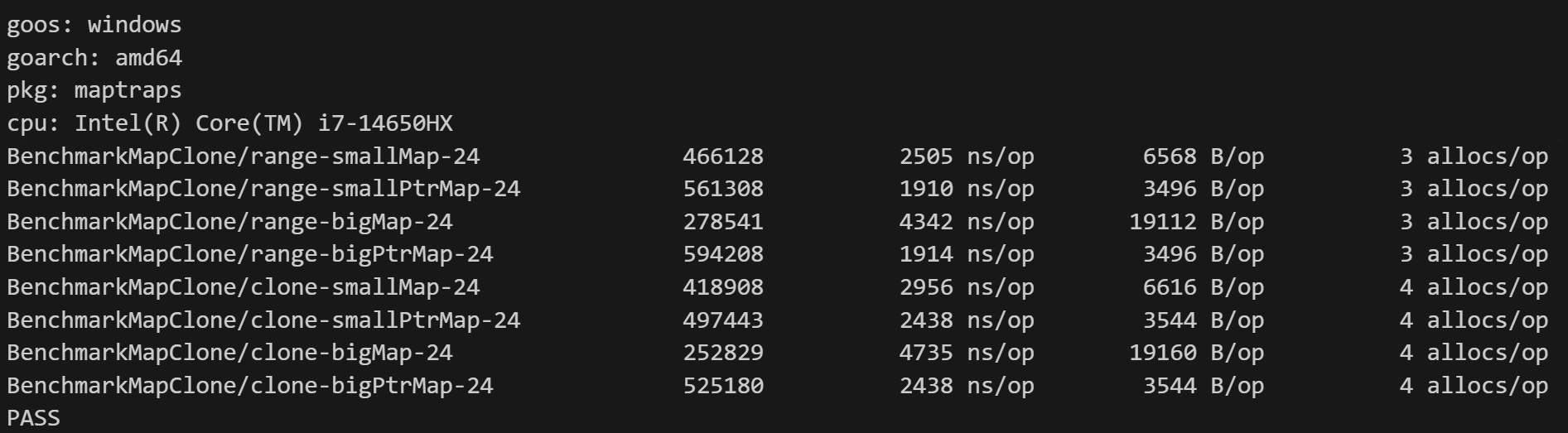 修复后结果就和1.22以及1.23一样了。总得来说maps.Clone虽然多浪费了一点内存,但速度是循环复制的1.5~3倍。