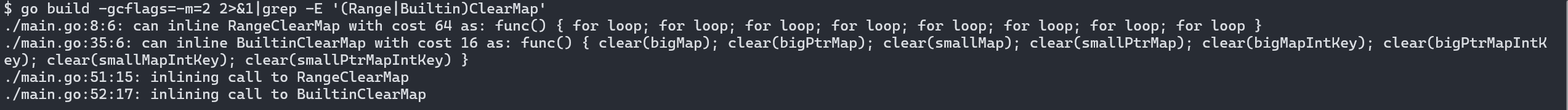尽管编译器最终会把两者优化成一样的对runtime的map清理函数的调用,但对for循环的优化在内联处理之后,因此for不仅让代码更长,也更容易错失内联优化的机会,而失去内联优化进而会影响逃逸分析从而损失更多性能,你可以在我以前的博客里看到内联和逃逸分析对内联的影响。