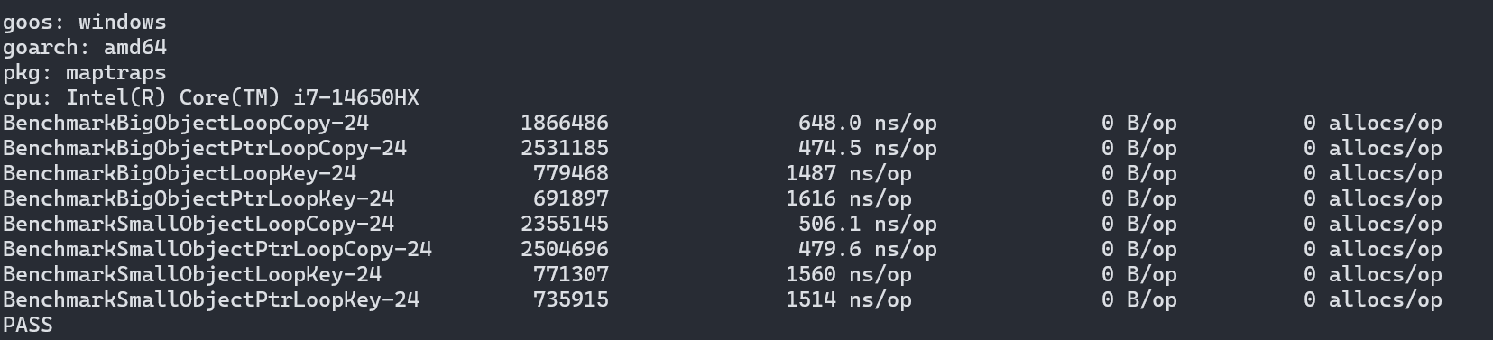 8种case就是大value的map和小value的分别用k,v := range map遍历和只用key遍历,看看性能差异。